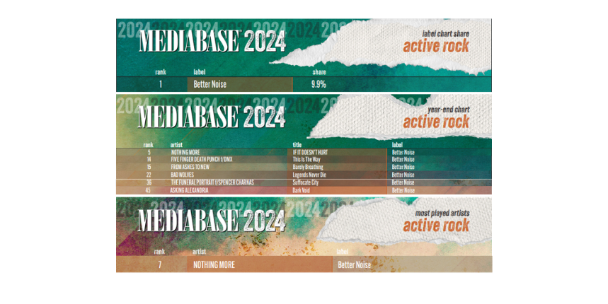 BETTER NOISE MUSIC también recuperó su título como sello #1 Mainstream Rock Airplay de Billboard y # 1 Mainstream Rock Airplay Imprint de 2024. El sello previamente hizo historia al clasificarse como el #1 Mainstream Rock Airplay Imprint durante cinco años consecutivos de 2018 a 2022. NOTHING MORE encabezó el Billboard's Mainstream Rock Airplay Songs Chart en el # 1 para “IF IT DOESN'T HURT” y también aterrizó en el # 8 en Mainstream Rock Airplay Artists. FROM ASHES TO NEW anotó el puesto #10 en Mainstream Rock Airplay Artists y su single “Barely Breathing (feat. Chrissy Costanza)” hizo el puesto #8 en el Mainstream Rock Airplay Songs Chart seguido por FIVE FINGER DEATH PUNCH en el #10 con “This is The Way (feat. DMX).”
