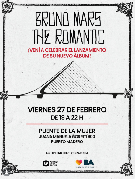 Tras una década de espera desde su último proyecto solista, el fenómeno global Bruno Mars regresa oficialmente con su cuarto álbum de estudio, The Romantic. Para marcar este hito, la Ciudad de Buenos Aires ha sido seleccionada como una de las sedes principales de la celebración internacional: el próximo 27 de febrero, el Puente de la Mujer será intervenido con una experiencia inmersiva que une la música, el arte y el romance porteño. Bajo la premisa de conectar con el espíritu romántico que define este nuevo álbum, este viernes desde las 19h el Puente de la Mujer en Puerto Madero se vestirá de gala para recibir a quienes quieran formar parte de esta jornada histórica de manera libre y gratuita . Entre las actividades de las que podrá participar el público se encontrará un karaoke con los mejores éxitos de Bruno, el tradicional ritual de los "candados del amor" en una versión personalizada bajo el universo de Mars, espacios exclusivos para fotografías, entre otras sorpresas, además de un despliegue visual nunca antes visto. El lanzamiento de The Romantic llega en el momento más prolífico de la carrera de Mars. El primer sencillo del álbum, “I Just Might”, debutó en el número 1 del Billboard Hot 100, convirtiéndose en su décimo tema en alcanzar la cima y su primer debut directo en el puesto máximo. Este éxito se suma a un 2025 de dominio absoluto, donde su colaboración con Lady Gaga, “Die With A Smile ”, fue la canción más rápida en alcanzar mil millones de reproducciones en Spotify, mientras que “APT.” (con ROSÉ) se consagró como el sencillo global más vendido del año y obtuvo tres nominaciones a los GRAMMY® 2026. Con más de 150 millones de oyentes mensuales , Mars es actualmente el artista #1 del mundo en Spotify. Su legado incluye hitos como ser el primer artista en obtener seis sencillos certificados Diamante por la RIAA, cifra que en 2026 ya asciende a siete, con “Just the Way You Are” posicionada como la canción más certificada de la historia (21 discos de Platino). |