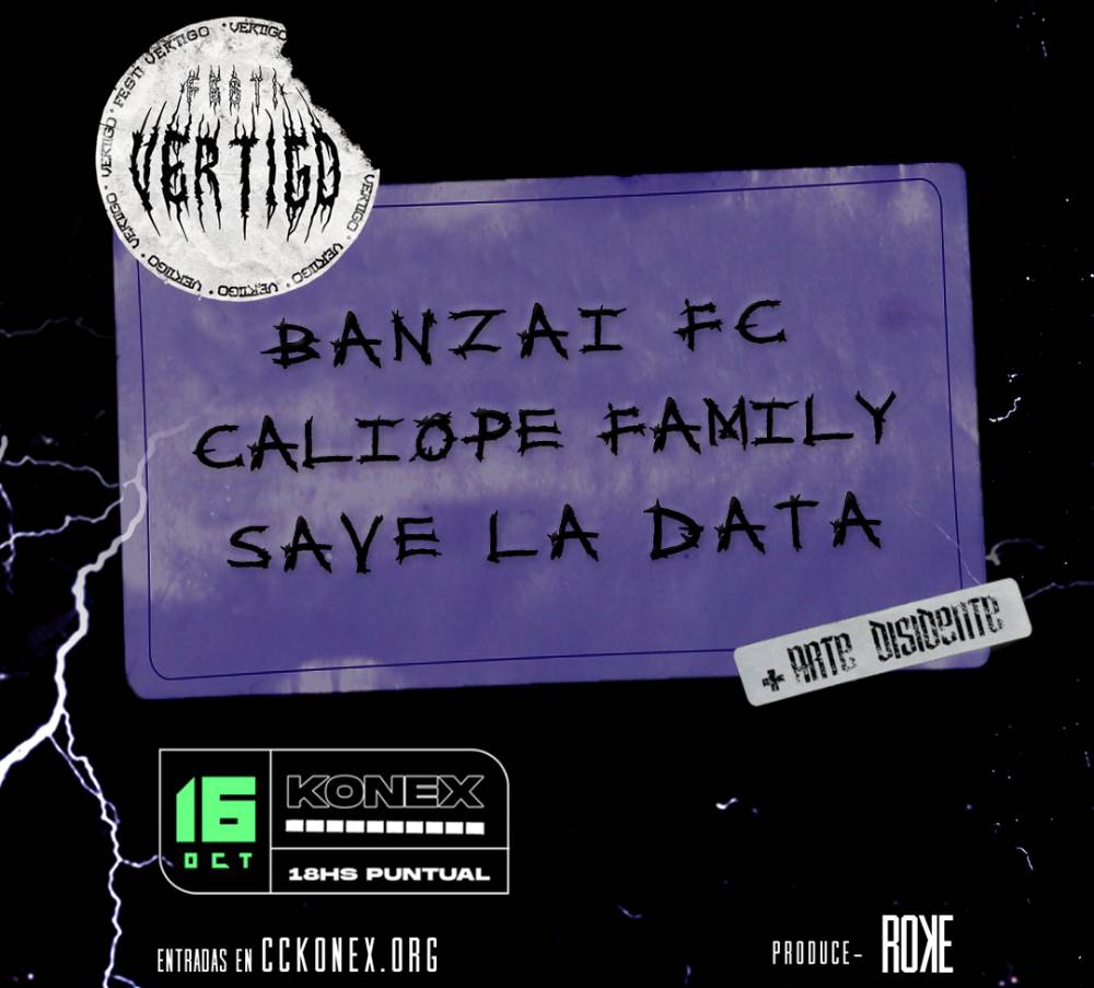 Este sábado a las 18 hs la cita es en el patio del Centro Cultural Konex donde el nuevo Festival Vertigo nos convoca en su segunda edición para compartir una tarde cargada de música urbana joven y rock adulterado. Banzai FC, Save la Data y la banda rosarina Caliope Family confluyen en una tarde en la el ADN es el underground.
