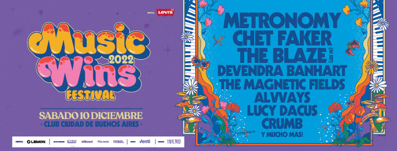 El festival más querido por la escena independiente argentina está de vuelta. Music Wins Festival 2022 tendrá lugar en el Club Ciudad de Buenos Aires el sábado 10 de diciembre, y contará con un lineup de lujo donde figuran Metronomy, The Blaze y Chet Faker como atracciones principales. Devendra Banhart, The Magnetic Fields, Alvvays, Lucy Dacus y Crumb completan el cartel internacional. El lineup se completa con lo mejor de la escena nacional, artistas que se anunciarán próximamente.