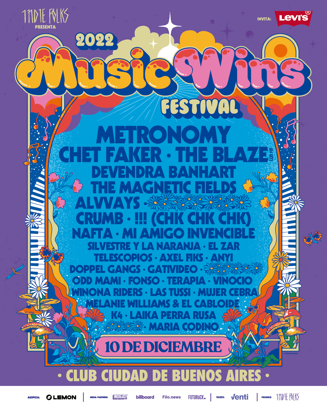 Finalmente, Music Wins Festival 2022 anuncia su line-up completo donde figuran Metronomy, Chet Faker y The Blaze como atracciones principales. Devendra Banhart, The Magnetic Fields, Alvvays, !!! (Chk Chk Chk) y Crumb completan el cartel internacional. La grilla incorpora lo mejor de la escena nacional, presentado ahora a NAFTA, Mi Amigo Invencible, Silvestre y La Naranja, El Zar y muchas más. El festival tendrá lugar en el Club Ciudad de Buenos Aires el sábado 10 de diciembre, y las entradas ya están a la venta en venti.com.ar.