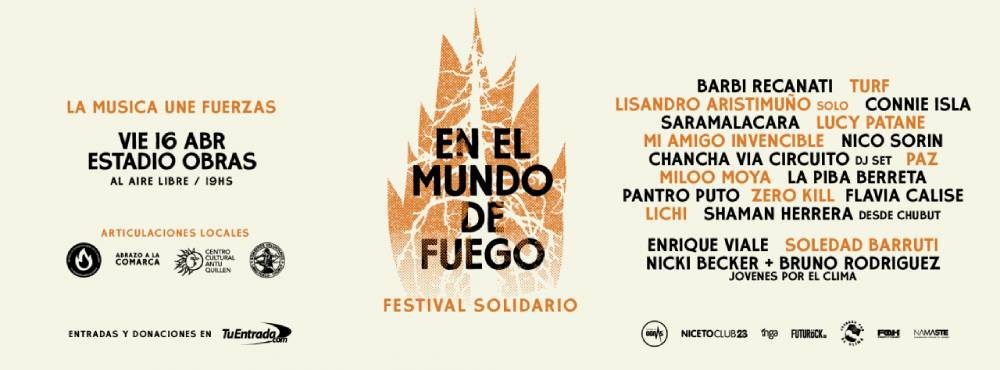 El festival solidario a beneficio de la reconstrucción de hogares en la patagonia, En el Mundo de Fuego se reprogramó para este viernes 16 de abril. El evento mantendrá su ubicación en el Estadio Obras, comenzando a las 19hrs, con capacidad limitada y los protocolos sanitarios vigentes.