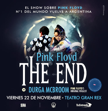 El 22 de noviembre a las 20.30 hs la banda se presentará en el emblemático teatro Gran Rex junto a la vocalista original de la banda Durga McBroom. The End es una banda argentina que interpreta, desde 1991, los temas y discos más emblemáticos de Pink Floyd.