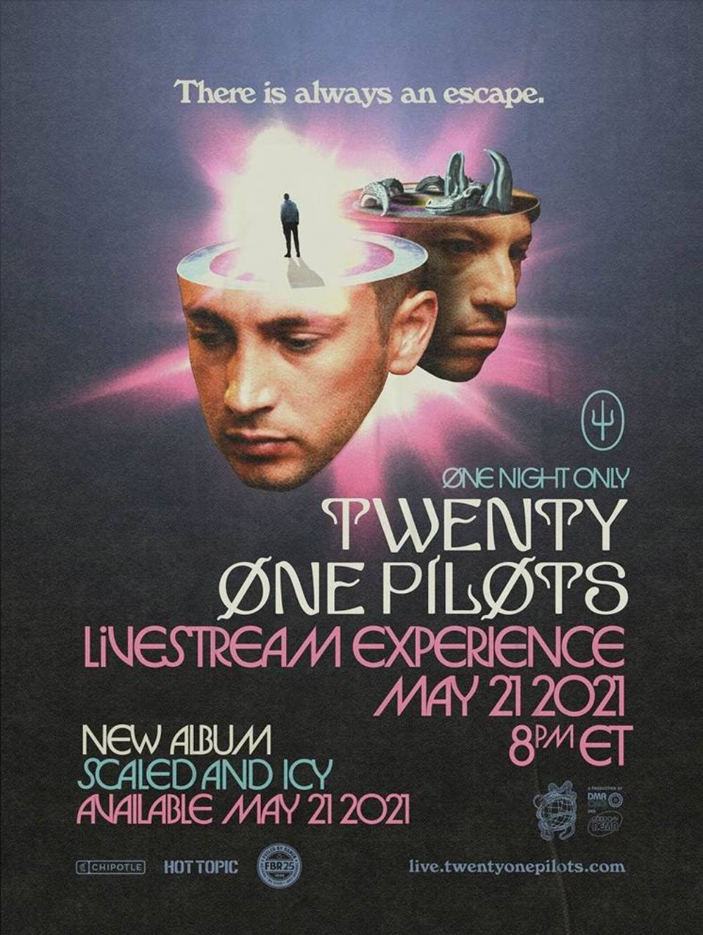 El primer evento internacional por streaming de la banda Twenty One Pilots - Livestream Experience será transmitido el viernes 21 de mayo a las 21hs de Argentina y promete ser un show inolvidable del dúo, con una lista de canciones de su catálogo y el debut en vivo del nuevo material de Scaled And Icy. Producido por Team Twenty One Pilots Production, el show en vivo multisensorial cuenta con la participación de antiguos colaboradores y socios creativos, como TNSN DVSN, Reel Bear Media, Element1 y lili STUDIOS.