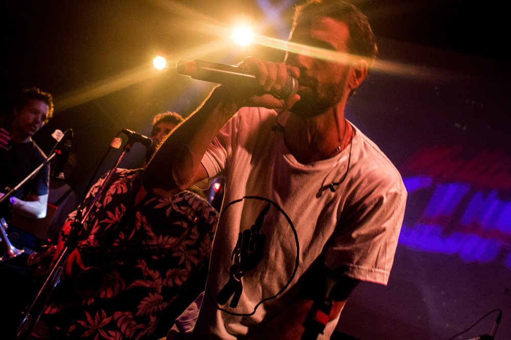 Si la noche había arrancado demasiado politizada, los primeros acordes que mejor saben desplegar un sonido funky rompió las barreras. La única banda con vientos presentes, claros maestros del funk en un país que está aprendiendo de ello, fue generadora de un pogo amable desde el primer tema, donde los saltos y el agite fue contundente pero cuidado: “Eu loco, este lugar está muy encendido. Espero que siga así los quince minutos que nos quedan”.