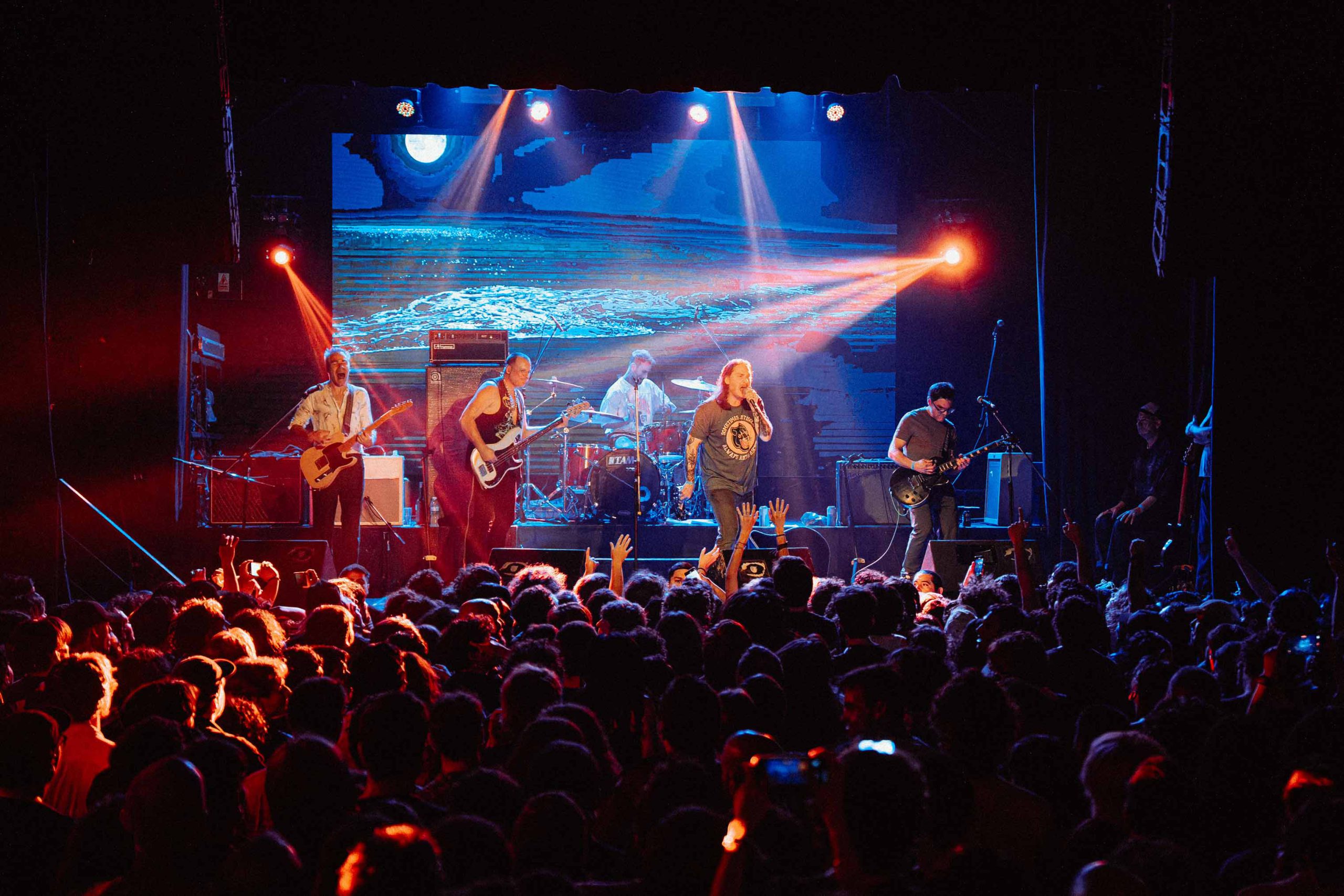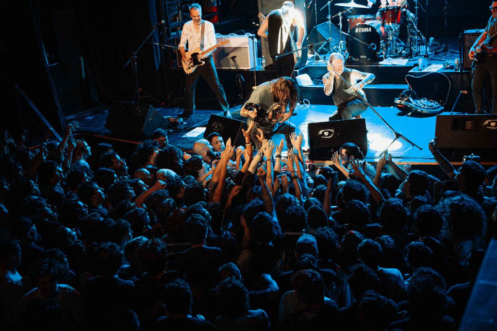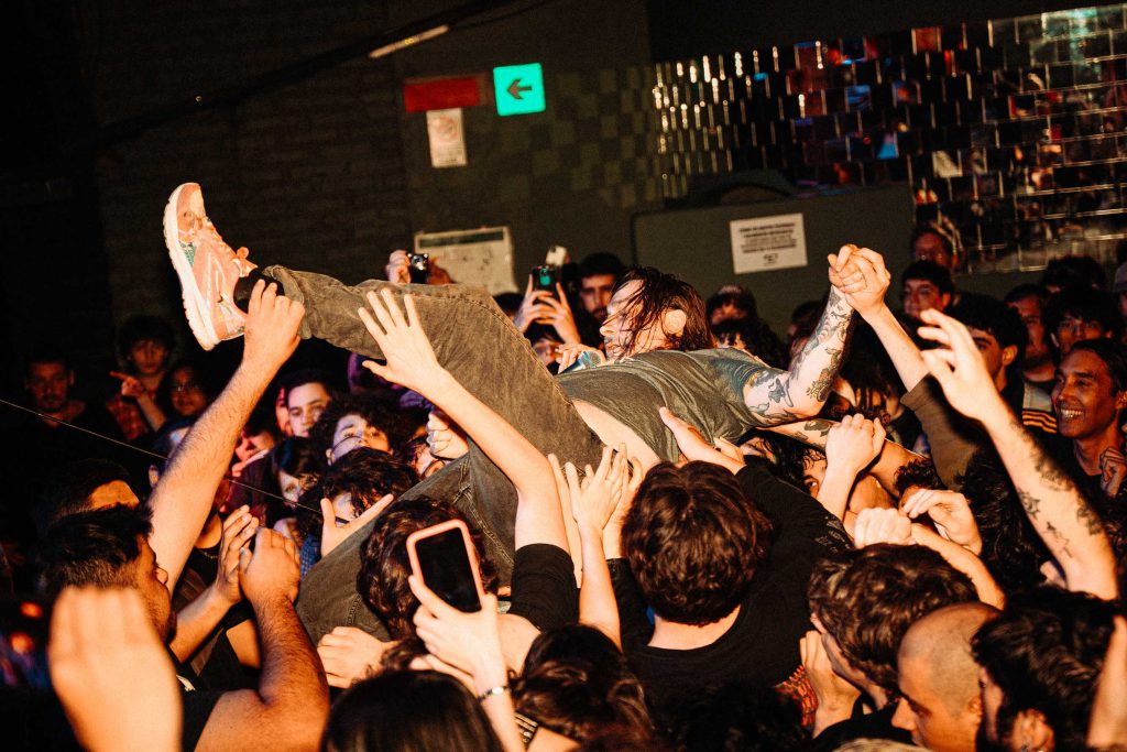 Pasan piernas sobre nuestras cabezas, Tim se tira al público una y otra vez. El pie de micrófono es como un arpón para la lucha. Por momentos siento que él es el principal artífice de la locura colectiva y por otros, que no sabe bien cómo frenarla. Trepan los primeros valientes al escenario. A medida que van pasando los temas, y con los muchachos de seguridad completamente resignados, el público entra en más y más confianza y ya suben como si nada. El escenario ahora es un trampolín gigante donde bailan, saludan y vuelven a tirarse a la masa de gente.