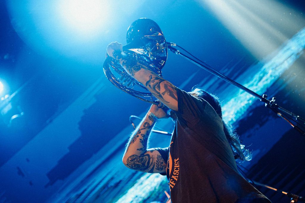 Pero esperen, porque la cosa se pone más entretenida. Porque una vez iniciado el show, lo musical iba a quedar completamente al margen, gracias al público que arrasó con todo. Arrancan con ‘In The Clear’. Tim Kinsella alza por el aire una trompa gigantesca y sopla como si fuera un vikingo. Desde ahí todo va en subida, y también en picada.