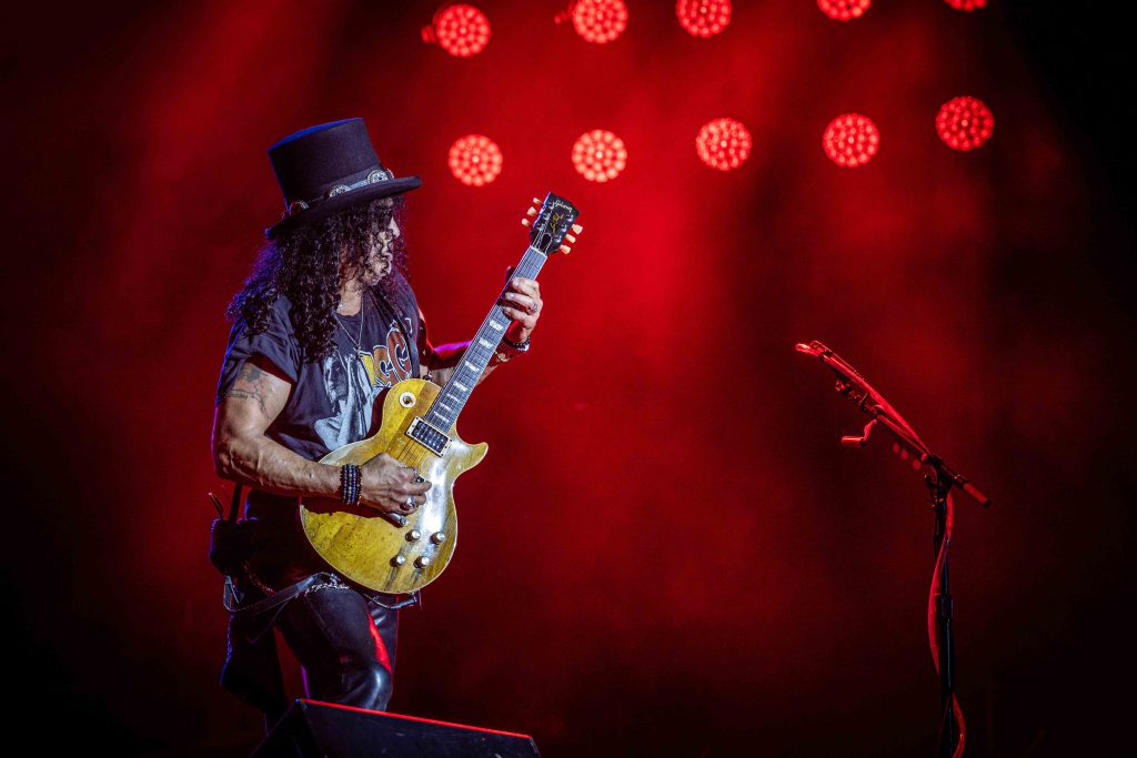 Desde el minuto uno, Slash acaparó la atención de todos los flashes y los celulares levantados. Muchos pagaron la entrada solo para verlo a él. No es para menos: es un dios. Un auténtico guitar hero. Donde algunos ven interminables solos de guitarra o recursos atípicos como el talk-box, los fanáticos ven cómo Saul hace magia con los dedos. Él es la razón por la que muchos chicos decidieron aprender a tocar el instrumento de seis cuerdas. El hombre de 60 años supo brillar de principio a fin, al igual que el tercer miembro fundador presente, el bajista Duff McKagan.