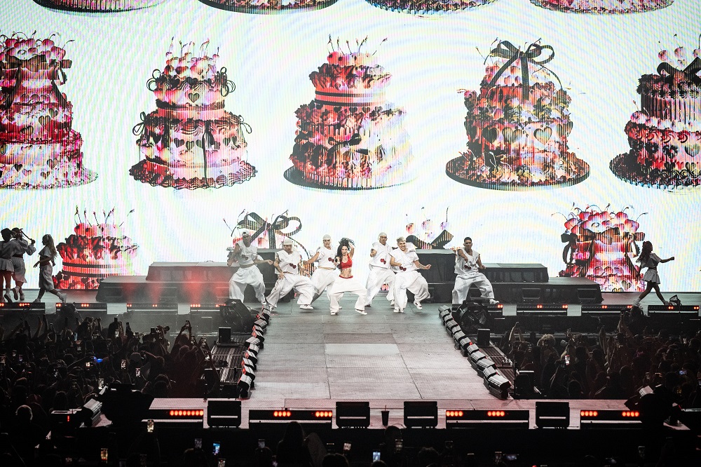 Desde antes del inicio del show, la puesta en escena nos atrapó con una representación precisa de la esencia callejera y festiva que caracteriza a la cantante. Acompañando esta ambientación, un imponente juego de luces y visuales enmarcaba la presentación. Ella abrió el espectáculo subida a una moto y al ritmo de ‘San Turrona’, mientras miles de fanáticos coreaban la canción con entusiasmo. El show contó también con una banda en vivo y una compañía de bailarines que aportó dinamismo al espectáculo con coreografías enérgicas y sincronizadas.