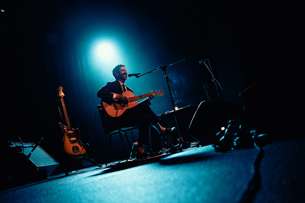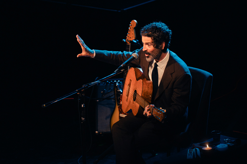 Una puesta en escena sencilla en exceso, una silla en el medio del escenario con el micrófono por delante, rodeado de dos guitarras, una acústica, una eléctrica. Junto a ellas, una mesita ratona que solo sostenía el vaso del que bebía el compositor y una vela, que se fue consumiendo poco a poco a medida que transcurría la velada.