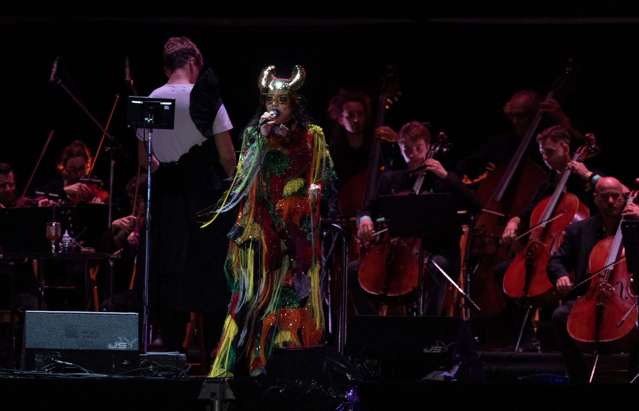La islandesa se destaca siempre por su vestuario y esta no fue la excepción. Vistió un colorido vestido con flecos y brillos de Alexander McQueen junto con una pieza dorada en su cabeza que terminaba en una máscara que bordeaba sus ojos. La imagen era surrealista: una orquesta tocando en un predio y un alien recién bajado de su nave espacial conducida por su gran voz. Al final de casi todas las canciones esbozaba un 'Gracias', con una erre marcada debido a su acento, lo que el público festejó coreando su nombre bajo la luna llena.
