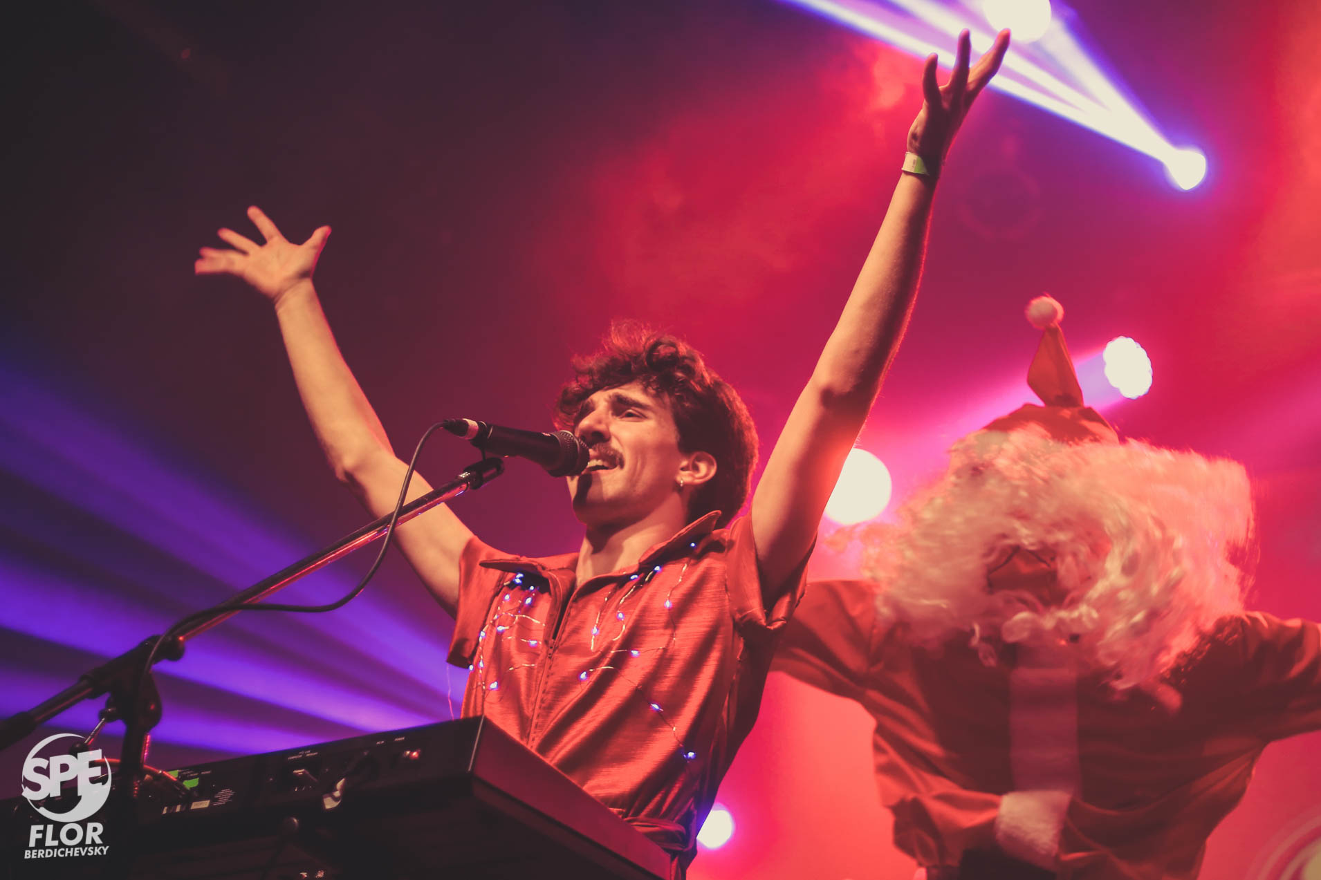 Una vez hecha la aclaración, podemos entender por qué la presencia escénica de Pedro Rosemblat, llevando un aplausómetro a la banda al comienzo del show, caiga tan bien en el público. Comprendemos por qué los chistes sobre la existencia de Papá Noel entre Renzo Montalbano y Willy Fischman son casi tan destacables como sus talentos en teclados, voces y guitarra. Sabiendo que Gativideo es una banda que hace apología de las modas bizarras de tiempos pasados y actuales, es aún más disfrutable escuchar (y bailar) el cover de ‘Guapa’ de Bandana, con particular lucimiento de las coristas Francisca Estrach, Sasha Conte y Laura Morgado. Del mismo modo, la presencia de un Spiderman disfrazado de Papá Noel emergiendo de la caja envuelta como regalo, su performance bailando al ritmo de ‘Vicios de Medianoche’ y el lanzamiento de chizitos de colores al público terminaban de redondear el mood bizarro de la noche.