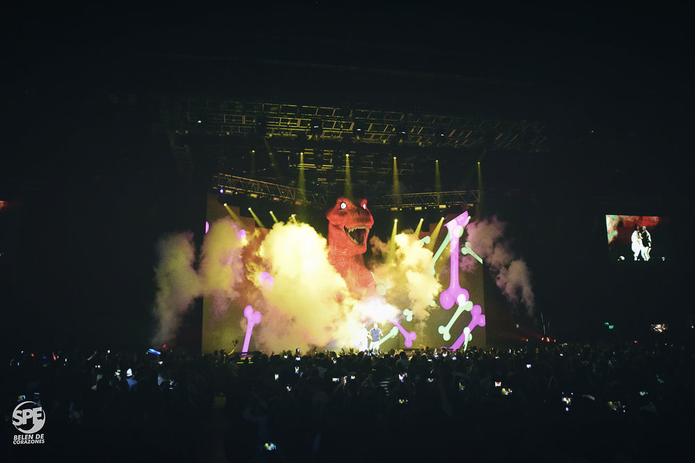 El colombiano J Balvin, de nacimiento José Álvaro Osorio Balvin, regresó a la Argentina un año después de su última visita a presentar su quinta placa discográfica, su trabajo más ambicioso hasta ahora. Su albúm Vibras, es una de las piezas de la música urbana más importantes del año, y su gira lo puso enfrente de un Luna Park sold out con mucho tiempo de sobra. El telón cayó antes de las 22hs y dejó ver a un solitario Balvin en el escenario con dos pantallas gigantes y un dinosaurio atrás que complementaban la puesta en escena. Para hacer el primer tema, ‘Machika’, se sumó la brasileña, Anitta, y después pasó a invitar a nada menos que a Duki, desatando la euforia del Luna desde el comienzo. ‘Ambiente’ fue otro gran hit de su álbum presentado temprano que puso de pie a todo el estadio. Después de unas cuantas barras improvisadas con mucho punch line con referencias argentinas y algunas menciones de honor al trap local (Paulo Londra, Cazzu, Khea), la distinguible y clásica intro de ‘Ginza’ emocionó hasta los gritos una vez más y puso a corear una de las primeras líneas del manifiesto Balvin.