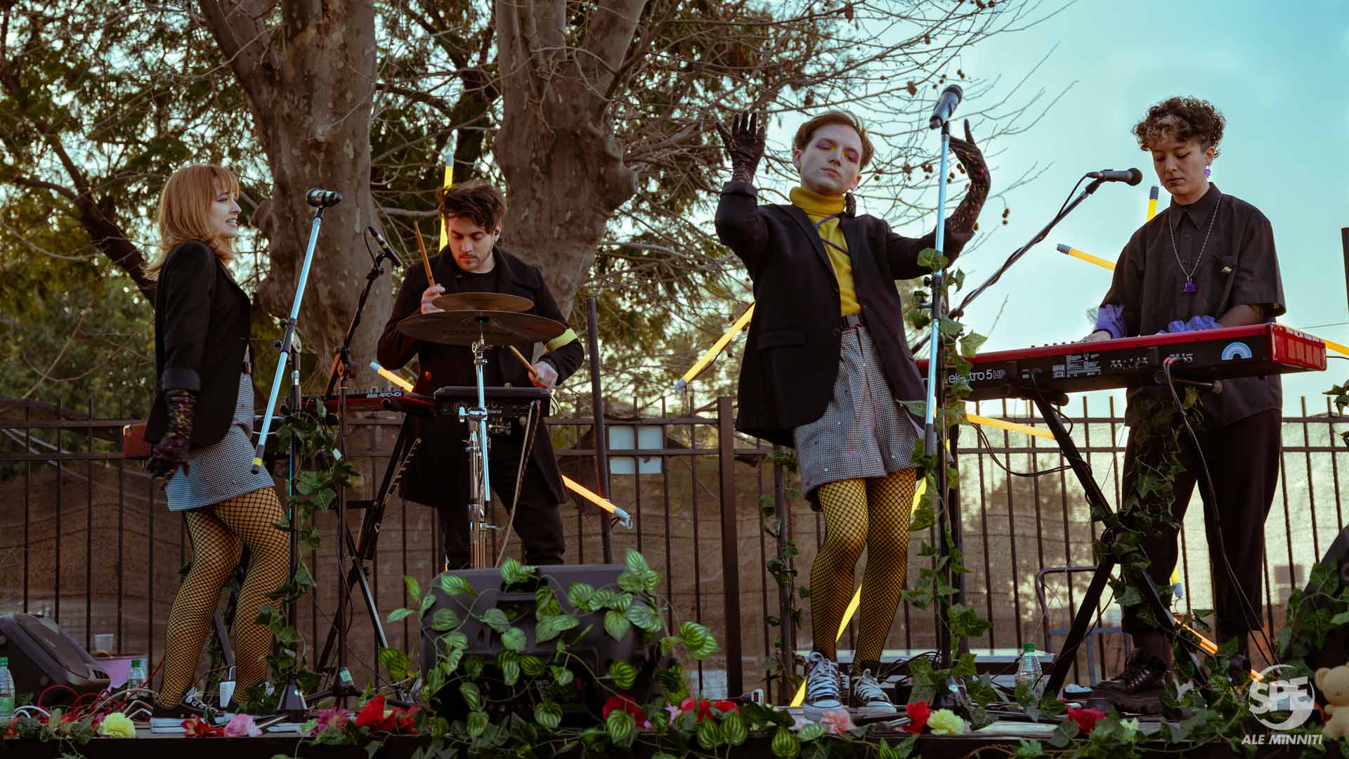 Rápidamente su cariz teatral se hizo presente en 'Hechizo', la segunda canción del set, con onomatopeyas que acompañaban los estornudos y el volcán que se mencionan en la letra. Luego de una breve pausa para tomar whisky en taza, llegaba 'Crol', mientras Ro desde las teclas se calzaba las antiparras para salir a nadar en la canción y se sumaba al juego actoral. Tanto Paloma como Tomás son actores y agregan al show el plus de sensibilidad y expresión performática de la disciplina. Otra de las particularidades es la importancia que le dan al vestuario, ya que ambos lucieron atuendos combinados: sweater amarillo y saco oscuro con short para él y pollera para ella, de color gris cuadrille con algunas lentejuelas de colores. Además, agregaron medias amarillas debajo de otras de red y guantes negros nevados para completar el look que estuvo a cargo de Federico Castellón. Como último punto, la escenografía de las tablas fue otro de los agregados, el escenario estaba decorado como un bosque lleno de plantas enredaderas y flores, con algún que otro osito de peluche escondido por ahí.