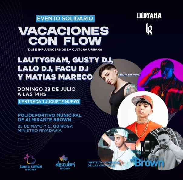 A pocos días de que terminen las vacaciones, la nueva escena de artistas que copan las redes sociales a puro cachengue y hit, se unieron para llevar a cabo esta iniciativa solidaria para los más chicos: Lauty Gram, Gusty DJ, Juli Savioli, Lalo DJ, DINA, Baby Cue, Virshi DJ, Bianca Lif y Facu DJ entre otros, se presentarán este domingos 28 de julio y el domingo 4 de agosto.