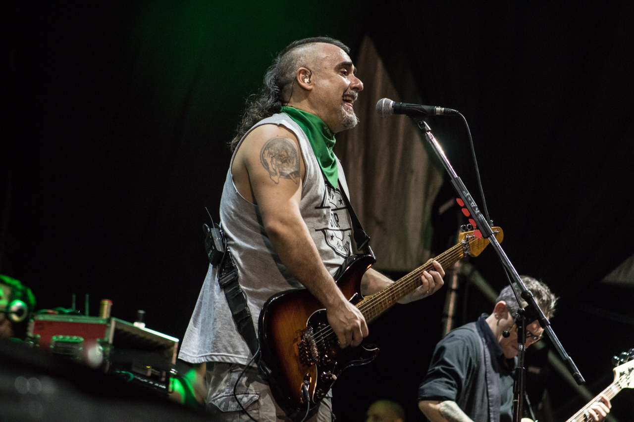 ‘No mires al cielo’ fue una advertencia de los Cadena Perpetua para todos y todas: eran las 19:30 y las nubes habían copado la parada y el celeste se convirtió en violeta. Así empezó una seguidilla de catorce tracks que sirvieron para recorrer los casi treinta años de trayectoria de un trío que nunca se olvidó de dónde viene y hacia dónde va. Lo de Vala, Edu y Chino es realmente admirable: si bien tocan para públicos relativamente reducidos, han compartido shows con casi todos los colegas punks que pisaron Argentina: Bad Religion, Green Day, La Polla Records, Ramones, Offspring, Dead Kennedys y hasta Anti-Flag. Son humildes, hacen colectas de alimentos y juguetes en sus fechas y representan a la autogestión de una manera ejemplar.