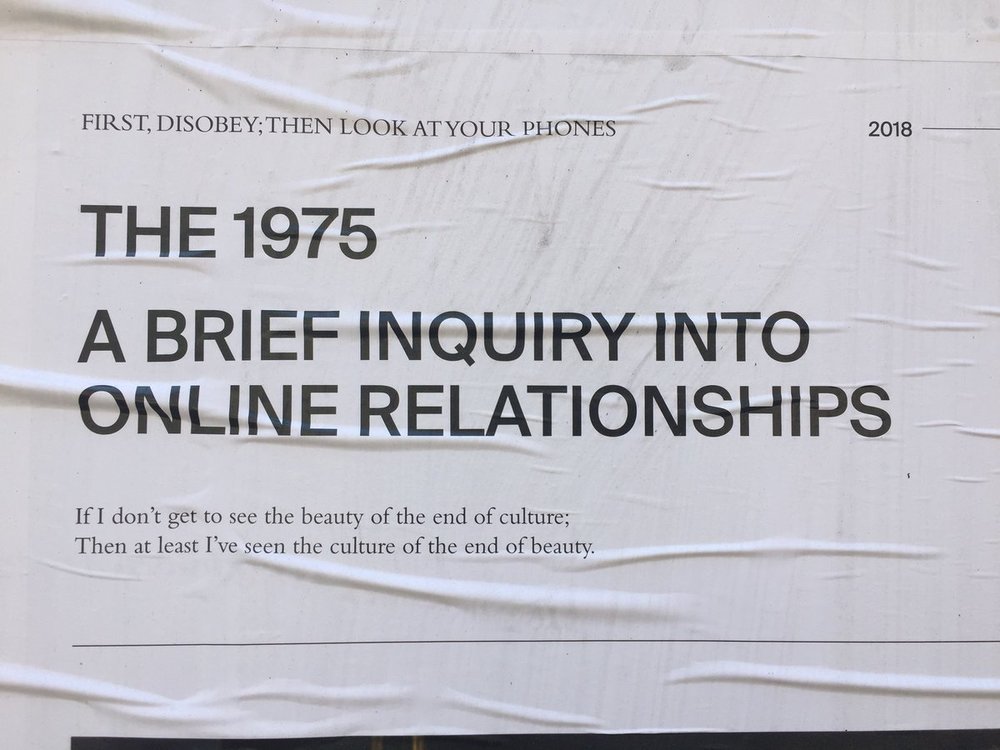 Retomando elementos del diseño propio de flyers informativos con estética minimalista, con fotografías de colores de baja intensidad y algo reminiscences a lo analógico, A Brief Inquiry Into Online Relationships se presentó primero en forma de poema en un poster con número de catálogo. Luego, continuaron con una serie de afiches con distintas inscripciones que hacen una sátira a la modernidad, con títulos como “planned obsolescence” y fotografías de los miembros de la banda en una atmósfera brumosa que recuerdan las duchas calientes.