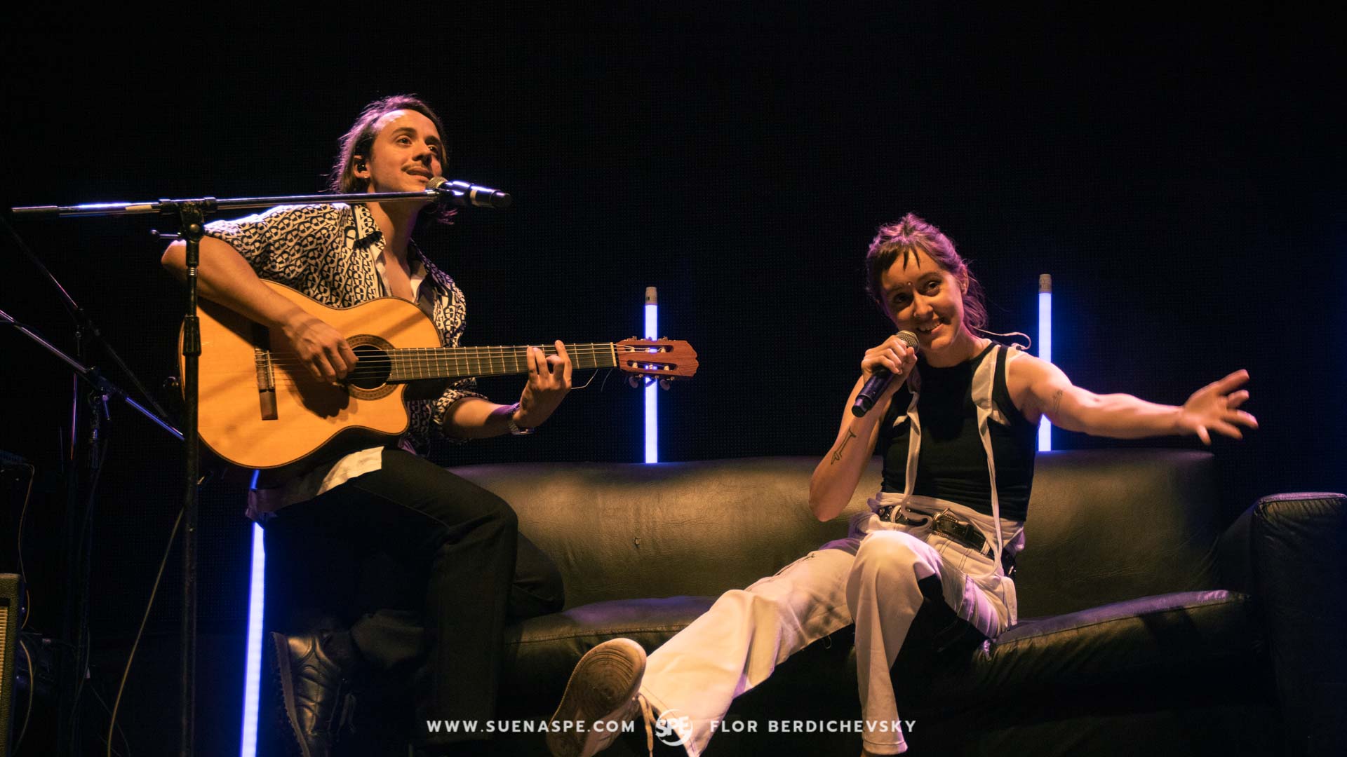 Un “canten Dopamina, por favor”, envolvió el lugar y todxs nos vimos representados en esa voz sin identidad que salía del tumulto de gente. Ese pedido fue cumplido y pudimos cantar su más reciente lanzamiento producido por Pablo. Le siguió ‘El Extraño’, sencillo del disco Animal (2018), dejando que la voz de Yago tome protagonismo y se robe nuestros corazones con su dulzura. El show agarra por otro camino y el ambiente se vuelve más íntimo. El escenario se transformó en un living y un sillón negro se materializa en el medio del lugar, y en él solo se encuentran los dos frontman sentados con una guitarra acústica haciendo repaso a sus anteriores discos Uno (2013) y Segundo (2015).
